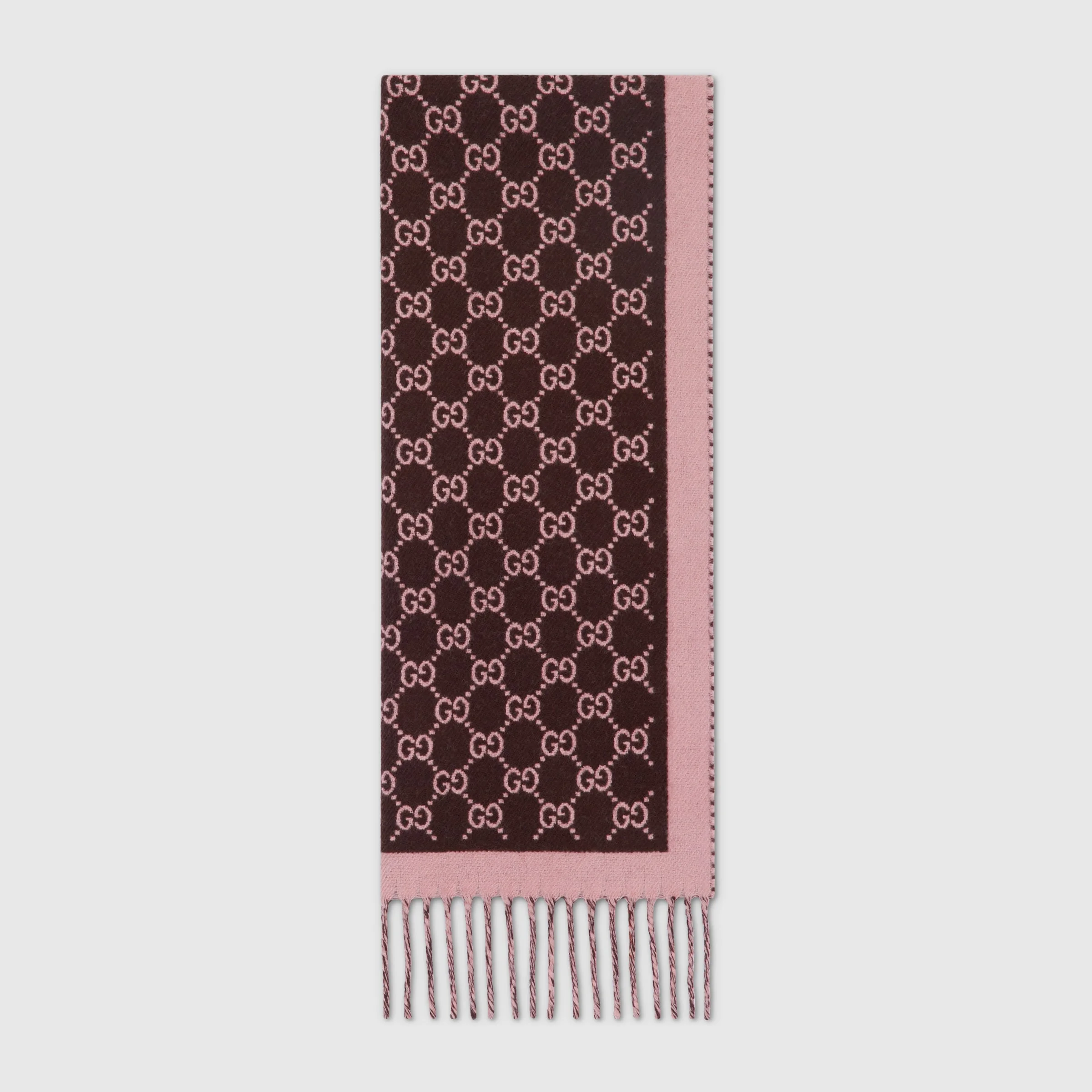 The Pre-Fall 2025 soft and silk accessories' collection animate House codes through sophisticated trimmings, logo patches and subtle embroideries. This scarf is stated in a GG wool with a tonal fringe trim. - Dark brown and pink GG wool on one side, pink wool on the other - Fringe trim - 13.3"W x 76.3"L - Made in Italy