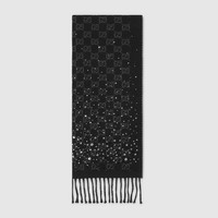 The Cruise 2026 women's soft accessories collection blends archival inspirations with 1990s opulence. This scarf is presented in GG wool with crystals and completed with a fringe trim. - Black and grey GG wool with crystals - Fringe trim - 13.7"W x 70.8"L