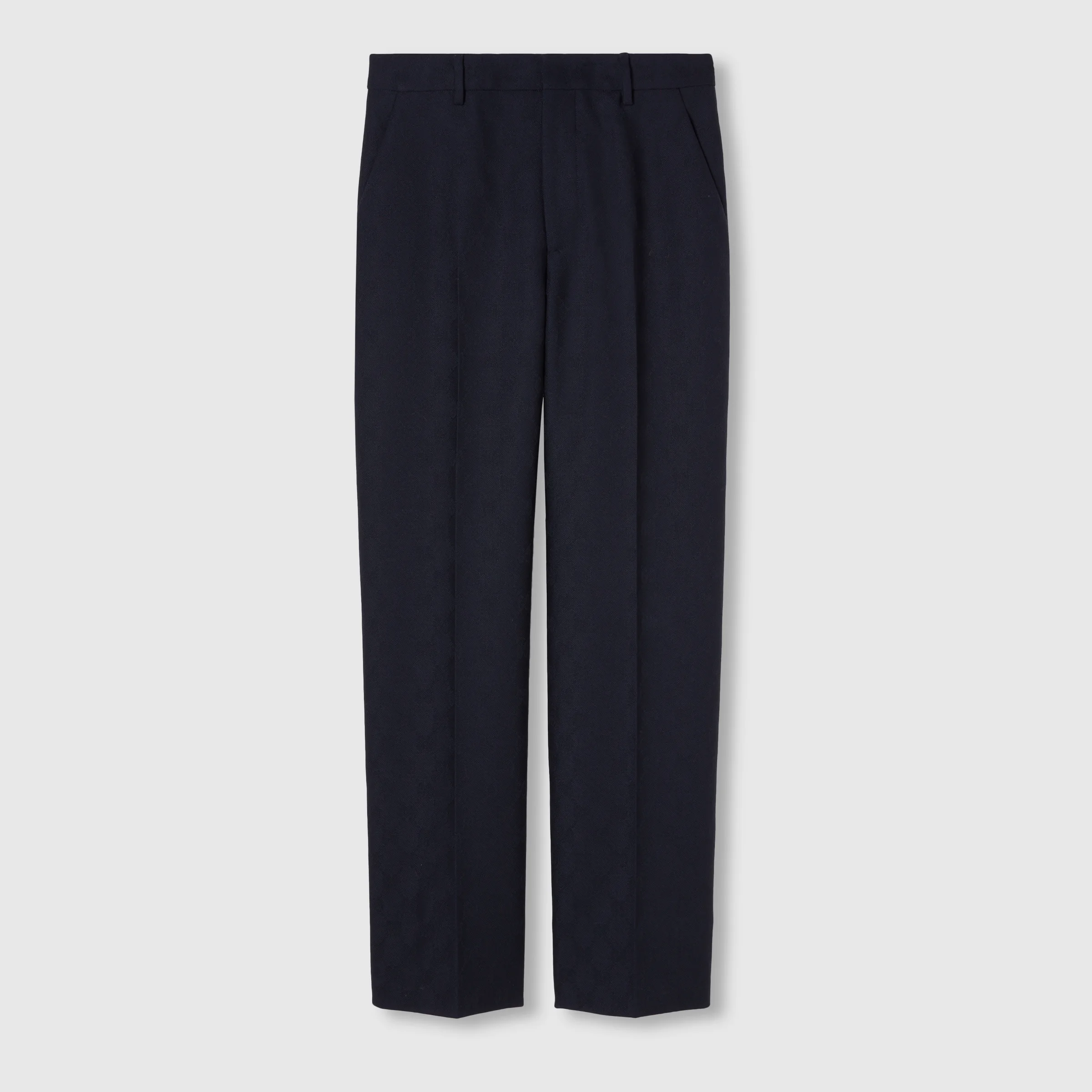 Emblematic codes of the House and refined patterns are reinterpreted in contemporary ways for the Pre-Fall collection. This pant is crafted from dark blue wool in the iconic GG pattern. The beautiful shade emphasizes the lightweight yet sophisticated material, cut for a regular, straight-leg fit. The construction reveals an internal tape belt in the waistband. - Internal tape belt - Dark blue wool - Unlined - Low waist - Belt loops - Hook and zip closure - Two side slit pockets - Two back pockets - Waist: 29.5 " based on a size 38 (IT) - Hips: 37.4 " based on a size 38 (IT) - Cut for a regular fit - Length: 38.7 " based on a size 38 (IT) - Leg opening: 8.7"; based on a size 40 - Made in Italy - The product shown in this image is a size 38 (IT)