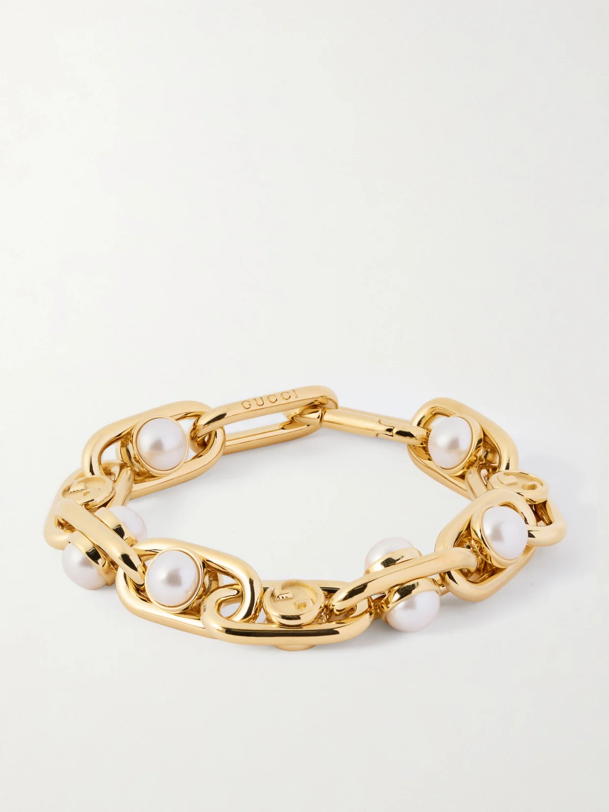 Gucci's bracelet is interspersed with lustrous faux pearls within each link. It's been crafted in Italy from gold-tone metal and finished with an engraved 'GG' charm at the center. We have the matching necklace in our edit, too.