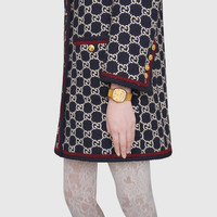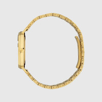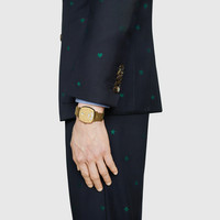 A clean, streamlined design that fits snugly around the wrist, the Grip watch takes its inspiration from the world of skateboarding, its name recalling the way the rider’s sneakers stick to the grip tape on a skateboard. The yellow gold PVD face has three windows to display the hour, minute and date, completed with a matching bracelet with engraved Interlocking Gs. - Yellow gold PVD case with Interlocking Gs, 3 windows indicating hour, minute and date, yellow gold PVD bracelet with Interlocking Gs - The warranty certificates for Gucci watches purchased after March 1st 2022 are exclusively available online. - Download your certificate at - by using the serial number engraved on the back of your watch. - Quartz movement - Water resistance: 3 ATM (100 feet/30 meters) - YA157403 - Swiss Made - Your Grip watch will arrive in a special edition floral jacquard topped packaging, available in a range of four different motifs inspired by the world of Gucci ready-to-wear. Further accentuated by a delicate gold floral pattern, the box will be individually selected for your watch and comes with a velvet pillow for product storage.