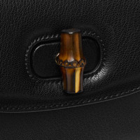 Introducing Spring Summer 2026. Gucci Bamboo 1947 proposes a lightweight design. The new construction features slim gussets and an innovative closure mechanism which clicks open and close in two positions. It is crafted from soft grainy leather that has been carefully aged by hand to create a time-worn, vintage-inspired effect. - Black soft grainy leather with natural glossy finish, aged by hand for a time-worn, vintage-inspired effect - Gold-toned hardware - Black nappa leather lining - Inside: 1 open pocket - Collapsible bamboo handle, drop: 4.3" - Adjustable leather strap under the flap, drop: 20.1" - New turnlock closure - 6.9"W x 4.5"H x 2.4"D - Weight: 1.5lbs approximately - Made in Italy - Fits iPhone Pro, Airpods, card case, and lipstick