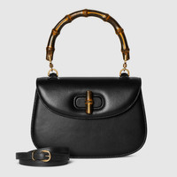 Introducing Spring Summer 2026. Gucci Bamboo 1947 proposes a lightweight design. The new construction features slim gussets and an innovative closure mechanism which clicks open and close in two positions. It is crafted from soft grainy leather that has been carefully aged by hand to create a time-worn, vintage-inspired effect. - Black soft grainy leather with natural glossy finish, aged by hand for a time-worn, vintage-inspired effect - Gold-toned hardware - Black nappa leather lining - Inside: 3 compartments, 1 zip pocket with Gucci Crest puller, 1 open pocket - Collapsible bamboo handle, drop: 4.7" - Detachable and adjustable leather strap under the flap, drop: 16.9" - 20.5"; length: 48" - 54.3" - New turnlock closure - 8.7"W x 5.5"H x 2.8"D - Weight: 1lbs approximately - Made in Italy - Fits iPhone Pro Max/Plus, Airpods, small wallet, and lipstick