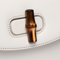 Introducing Spring Summer 2026. Gucci Bamboo 1947 proposes a lightweight design. The new construction features slim gussets and an innovative closure mechanism which clicks open and close in two positions. It is crafted from soft grainy leather that has been carefully aged by hand to create a time-worn, vintage-inspired effect. - White soft grainy leather with natural glossy finish, aged by hand for a time-worn, vintage-inspired effect - Gold-toned hardware - White nappa leather lining - Inside: 3 compartments, 1 zip pocket with Gucci Crest puller, 1 open pocket - Collapsible bamboo handle, drop: 4.7" - Detachable and adjustable leather strap under the flap, drop: 16.9" - 20.5"; length: 48" - 54.3" - New turnlock closure - 8.7"W x 5.5"H x 2.8"D - Weight: 1lbs approximately - Made in Italy - Fits iPhone Pro Max/Plus, Airpods, small wallet, and lipstick