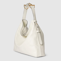 In the Fall Winter 2025 collection, crafted from soft smooth leather, the Gucci Beatrix handbag features a relaxed silhouette elevated by the signature Horsebit detail on the shoulder strap. The gold-toned hardware enhances its refined feel, while a zip pocket inside keeps essentials secure. - White soft smooth leather - Gold-toned hardware - White cotton linen lining - Horsebit detail on the shoulder strap - Inside: zip pocket - Adjustable shoulder strap: 10.2" – 13" drop; 37" length - W15.7" x H14.2" x D4.7" - Weight: approximately 2.2lbs - Made in Italy