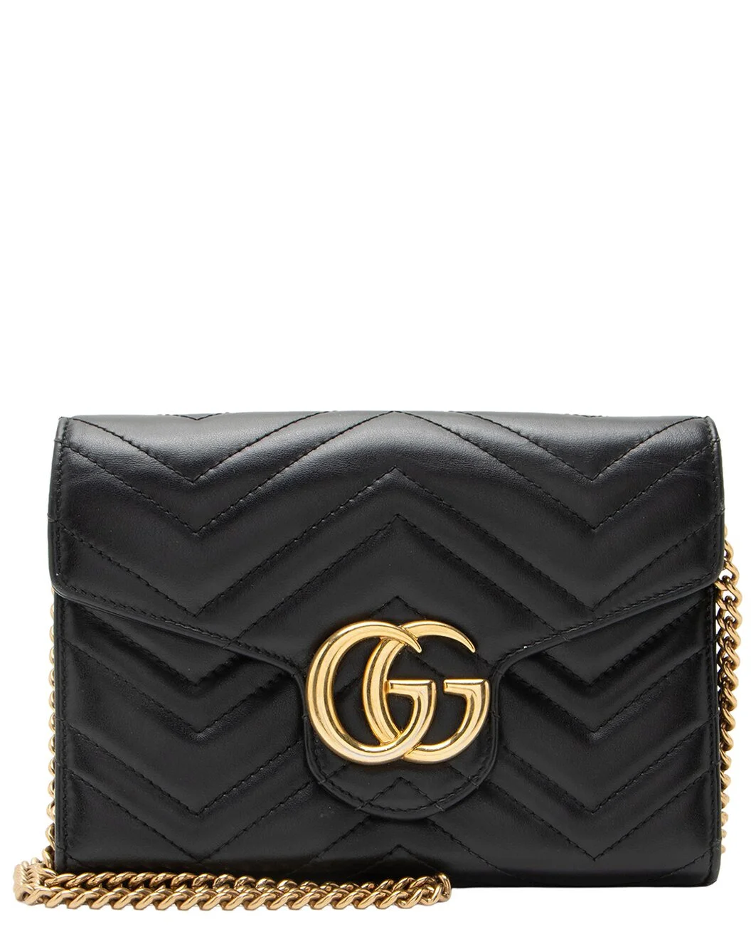 - About the brand: Eclectic and coveted. Italian luxury redefined. - This is an authentic, pre-loved piece. This item is in very good condition and shows light signs of wear. This item shows light scuffs and minor marks throughout exterior. light scuffs throughout exterior edges and corners. surface scratches and light tarnishing to hardware. scuffs and wear throughout interior flap. light marks and wear throughout interior. light warping to interior top leather edge. - For more information on condition, please see our condition guide at the bottom - GG Marmont Wallet on Chain in Black Leather with black fine textile lining and antique gold-tone hardware - Pockets: sixteen credit card slots, three interior - Measurements: 8in long x 1.5in wide x 5.75in high; 23in strap - Please note: All measurements were taken by hand and are approximate; slight variations may occur. - Accompanied by dust bag - Accompanied by detachable shoulder strap - Snap closure - The Pre-Loved Condition Guide - Our products are 100% genuine. In some cases we purchase merchandise from trusted independent suppliers and not directly from the brand owner. In all cases we stand by the authenticity of every product sold on our site.