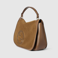 The new Gucci Blondie bag, whose distinctive logo first appeared in the House’s collections in the early 1970s, weaves together past and present in a fusion of nostalgia and modernity. This large top handle bag is crafted from light brown suede, featuring the House's round symbol in enamel. The style is complete with a leather top handle and adjustable shoulder strap. - Light brown suede - Light brown leather trim - Brown cotton linen lining - Enamel Round Interlocking G - Inside: 1 zip pocket - Top handle with 5.1" drop - Detachable and adjustable leather shoulder strap with 20" - 22.8" drop; length: 41" - 45.6" - Magnetic closure - Large: 20"W x 11.8"H x 5.1"D - Weight: 2.7lbs, approximately - Made in Italy - Fits iPhone Pro Max/Plus, Airpods, long wallet and lipstick