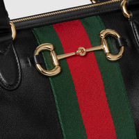 Introducing Spring Summer 2026. Gucci Borsetto is a wordplay that merges "borsa" (bag in Italian) and "morsetto" (Horsebit). The style is crafted from soft leather, and reveals a new lining with Diamante motif taken from the archive. - Black soft leather - Gold-toned hardware - Black canvas lining with Diamante motif - Horsebit, Web, and leather tag with "Made in Italy Gucci" logo - Inside: 1 zip pocket - Handle drop: 9" - Detachable and adjustable leather shoulder strap drop: 18.1" - 19.3"; length: 39.8" - 42.9" - Double zip closure - 15.2"W x 8.9"H x 5.1"D - Weight: 2lbs approximately - Made in Italy - Fits iPad, iPhone, long wallet, Airpods, and small items