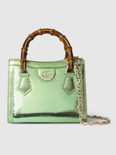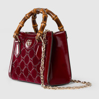 This Gucci Diana, one of the House's signature collections, is crafted in velvet and GG crystal motif. The tote bag style is complete with a bamboo handle, an intricate chain shoulder strap in light gold-toned finish. It can be worn crossbody or over the shoulder. - Gucci Rosso Ancora red velvet with GG crystal - Gucci Rosso Ancora red leather trim - Light gold-toned hardware - Gucci Rosso Ancora red silk satin lining - Double G - Inside: 1 open pocket - Bamboo handles with 3.1" drop - Removable chain shoulder strap with Interlocking G and 19.3" drop - Magnetic closure - Weight: .624kg approximately - 7.9"W x 6.1"H x 3.9"D - Made in Italy - Fits iPhone Pro Max/Plus, Airpods, long wallet, and lipstick