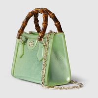 Gucci Diana, one of the House's signature collections, is introduced in embroidered silk satin, complete with its bamboo handle. The tote bag style can also be worn crossbody or over the shoulder. - Pale mint green silk satin - Sequin embroidery - Light gold-toned hardware - Light green silk satin lining - Double G - Inside: 1 open pocket - Bamboo handles with 3.1" drop - Removable chain shoulder strap with Interlocking G and 19.3" drop - Magnetic closure - Weight: .624kg approximately - 7.9"W x 6.1"H x 3.9"D - Made in Italy - Fits iPhone Pro Max/Plus, Airpods, long wallet, and lipstick