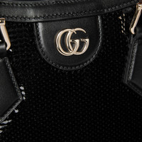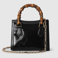 Gucci Diana, one of the House's signature collections, is introduced in embroidered silk satin, complete with its bamboo handle. The tote bag style can also be worn crossbody or over the shoulder. - Black silk satin - Sequin embroidery - Light gold-toned hardware - Black silk satin lining - Double G - Inside: 1 open pocket - Bamboo handles with 3.1" drop - Removable chain shoulder strap with Interlocking G and 19.3" drop - Magnetic closure - Weight: .624kg approximately - 7.9"W x 6.1"H x 3.9"D - Made in Italy - Fits iPhone Pro Max/Plus, Airpods, long wallet, and lipstick