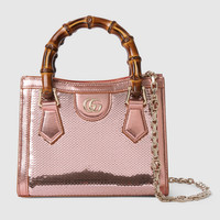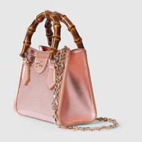 Gucci Diana, one of the House's signature collections, is introduced in embroidered silk satin, complete with its bamboo handle. The tote bag style can also be worn crossbody or over the shoulder. - Light pink silk satin - Sequin embroidery - Light gold-toned hardware - Light pink silk satin lining - Double G - Inside: 1 open pocket - Bamboo handles with 3.1" drop - Removable chain shoulder strap with Interlocking G and 19.3" drop - Magnetic closure - Weight: .624kg approximately - 7.9"W x 6.1"H x 3.9"D - Made in Italy - Fits iPhone Pro Max/Plus, Airpods, long wallet, and lipstick