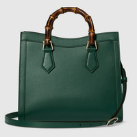The Gucci Diana in smooth leather is defined by its bamboo handle, a signature element of the House. The design can be worn crossbody or over the shoulder, presented in a sumptuous color for the season. - Green smooth leather - Light gold-toned hardware - Green cotton linen lining - Double G - Inside: 1 open pocket - Bamboo handles with 2.8" drop - Detachable and adjustable leather shoulder strap: 18.9" - 21.7" drop; length: 37" - 42.9" - Detachable and adjustable Web shoulder strap: 16.5" - 26.8" drop; length: 34.3" - 54.3" - 10.6"W × 9.5"H × 4.3"D - Weight: 2lbs, approximately - Fits iPhone Pro Max/Plus, Airpods, long wallet, and lipstick