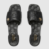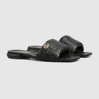 Crafted from the refined GG leather, this statement piece combines heritage-inspired design with contemporary elegance. Featuring the signature Double G hardware, the sandal exudes timeless charm and brand prestige. - Black GG leather - Women's - Light gold-toned hardware - Leather lining - Double G - Flat - Height: 0.5" - Made in Italy