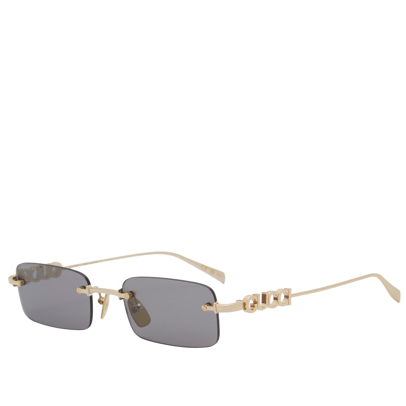 Designed to elevate your eyewear collections, these Gucci Sunglasses feature sleek gold tone frames. Contrasted with tinted rectangular lenses, the iconic Gucci logo is worked into the shape of the temple for a bold look. - 100% UVA Protection - Metal Frame - Rectangular Lens - Embroidered Branding - Style Code: GG1808S-003