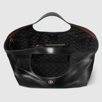 Continuing the spirit of reinvention, Gucci Giglio reinterprets the House's emblematic GG motif with sumptuous materials and rich colors that speak to the season. Crafted in soft glossy leather, this capacious bag features the Web trim, and is complete with a detachable pouch. - Black soft glossy leather - Light gold-toned hardware - Black GG canvas lining - Double G - Detachable pouch - Outside: D-rings - 7.1" handle drop - Hidden magnetic closure - 16.5" (23.6")W x 18.5"H x 6.3"D - Weight: 1.3lbs approximately - Made in Italy - Fits an iPad, iPhone, Airpods and small items