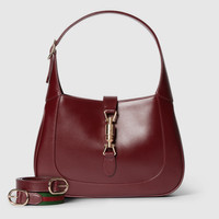The new Jackie 1961 is crafted from fine leather which highlights the craftsmanship, crescent shape, and sleek silhouette of the House's iconic shoulder bag. Light gold-toned hardware, leather trim, and an additional strap featuring the green and red Web gives this Jackie 1961 small shoulder bag in Gucci Rosso Ancora leather, the signature red hue of the House, further styling options. - Gucci Rosso Ancora Leather - Light gold-toned hardware - Leather lining - Interior: 1 zip pocket with Gucci Crest zip puller - Additional leather strap with 20.5" drop - 7.1" handle drop - Detachable Web shoulder strap with 20.5" drop - Piston closure - Weight: 0.9lbs, approximately - Small size: 10.8"W x 7.5"H x 1.6"D - Made in Italy - The model is 5'8" tall - Fits up to: iPhone Pro Max/Plus, Airpods, long wallet, and lipstick