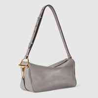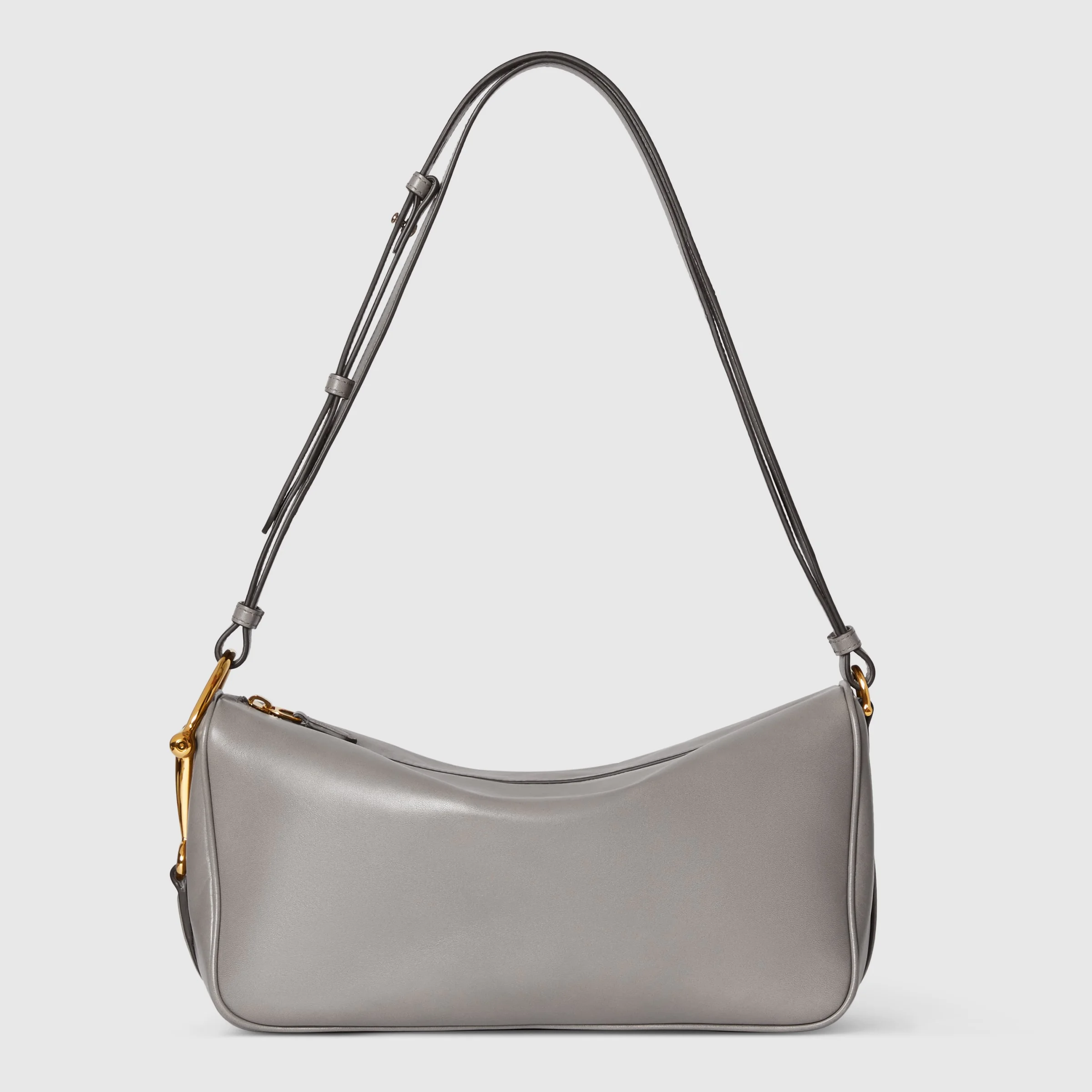 Gucci Half Horsebit offers a contemporary take on one of the House’s most emblematic codes. The style is defined by its relaxed silhouette and half of the signature hardware which has inspired the name. - Grey soft glossy leather - Gold-toned hardware - Brown cotton linen lining - Half Horsebit - Inside: 1 open pocket - Adjustable leather shoulder strap drop 12.6" - 13.4"; length: 26" - 28.7" - Zip closure - 12.4"W x 6.7"H x 4.7"D - Weight: 1.5lbs approximately - Fits iPhone Pro Max/Plus, Airpods, long wallet, and lipstick
