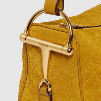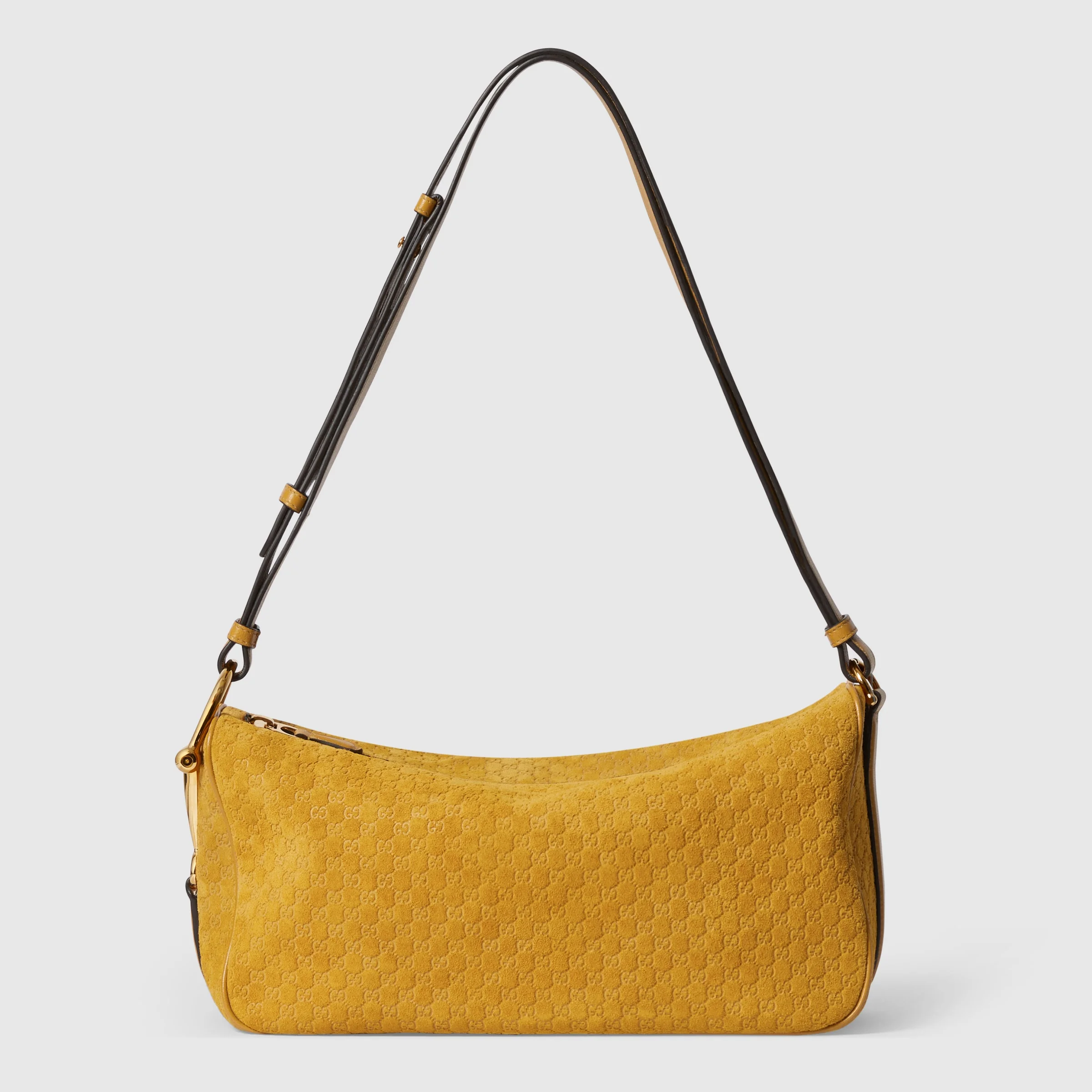 Gucci Half Horsebit offers a contemporary take on one of the House’s most emblematic codes. The style is defined by its relaxed silhouette and half of the signature hardware which has inspired the name. - Mustard yellow embossed GG suede - Gold-toned hardware - Brown cotton linen lining - Half Horsebit - Inside: 1 open pocket - Adjustable leather shoulder strap drop 12.6" - 13.4"; length: 26" - 28.7" - Zip closure - 12.4"W x 6.7"H x 4.7"D - Weight: 1.5lbs approximately - Fits iPhone Pro Max/Plus, Airpods, long wallet, and lipstick