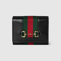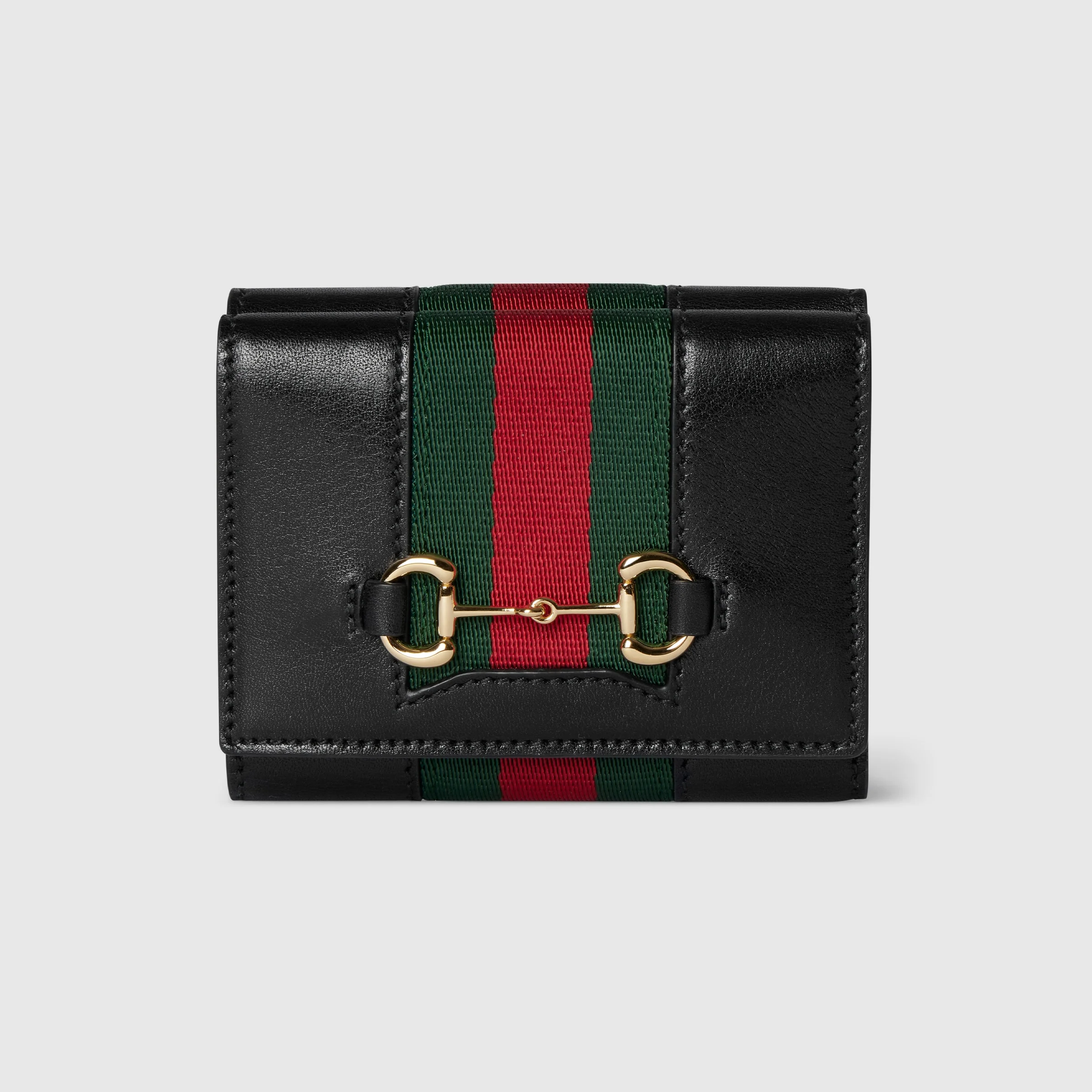Introducing Spring Summer 2026. New small leather goods designs pay tribute to the Horsebit, pairing the emblematic hardware detail with a Web stripe for a touch of retro-inspired elegance. This tri-fold style is crafted from soft leather. - Black soft refined leather - Gold-toned hardware - Black fabric lining - Horsebit, Web, and Made in Italy by Gucci logo - Snap button closure - Closed: 3.9"W x 3.1"H x 1.6"D; open: 3.9"W x 9.4"H - Weight: 4.1oz approximately - Made in Italy