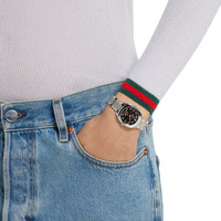 The Gucci Interlocking line combines sporty appeal with vibrant hues and archival symbols of the House. This watch in 29mm case features a stainless steel case with a black dial, enriched with diamonds and completed with a small seconds display. - 29mm stainless steel case - Black sunbrushed dial with diamonds and pink gold-plated details, Interlocking G small seconds display - Sapphire glass with antireflective coating - The warranty certificates for Gucci watches purchased after March 1st 2022 are exclusively available online. - Download your certificate at - by using the serial number engraved on the back of your watch. - Quartz movement - 5 ATM (50 meters/164 feet) - Wrist size from 5.1" to 7.5" - YA142513 - Swiss Made