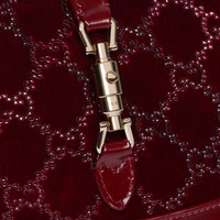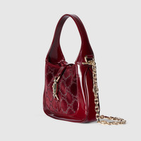 The Gucci Jackie 1961 with its signature piston closure and emblematic shape tells a story that spans eras. Crafted in velvet and GG crystal motif, this style is complete with an intricate chain shoulder strap in light gold-toned finish. - Gucci Rosso Ancora red velvet with GG crystal - Gucci Rosso Ancora red leather trim - Light gold-toned hardware - Gucci Rosso Ancora red silk satin lining - Inside: 1 card slot - 3.9" handle drop - Piston closure - 7.5"W x 5.1"H x 1.2"D - Weight: 12.2oz approximately - Fits iPhone Pro, Airpods, small wallet, and lipstick