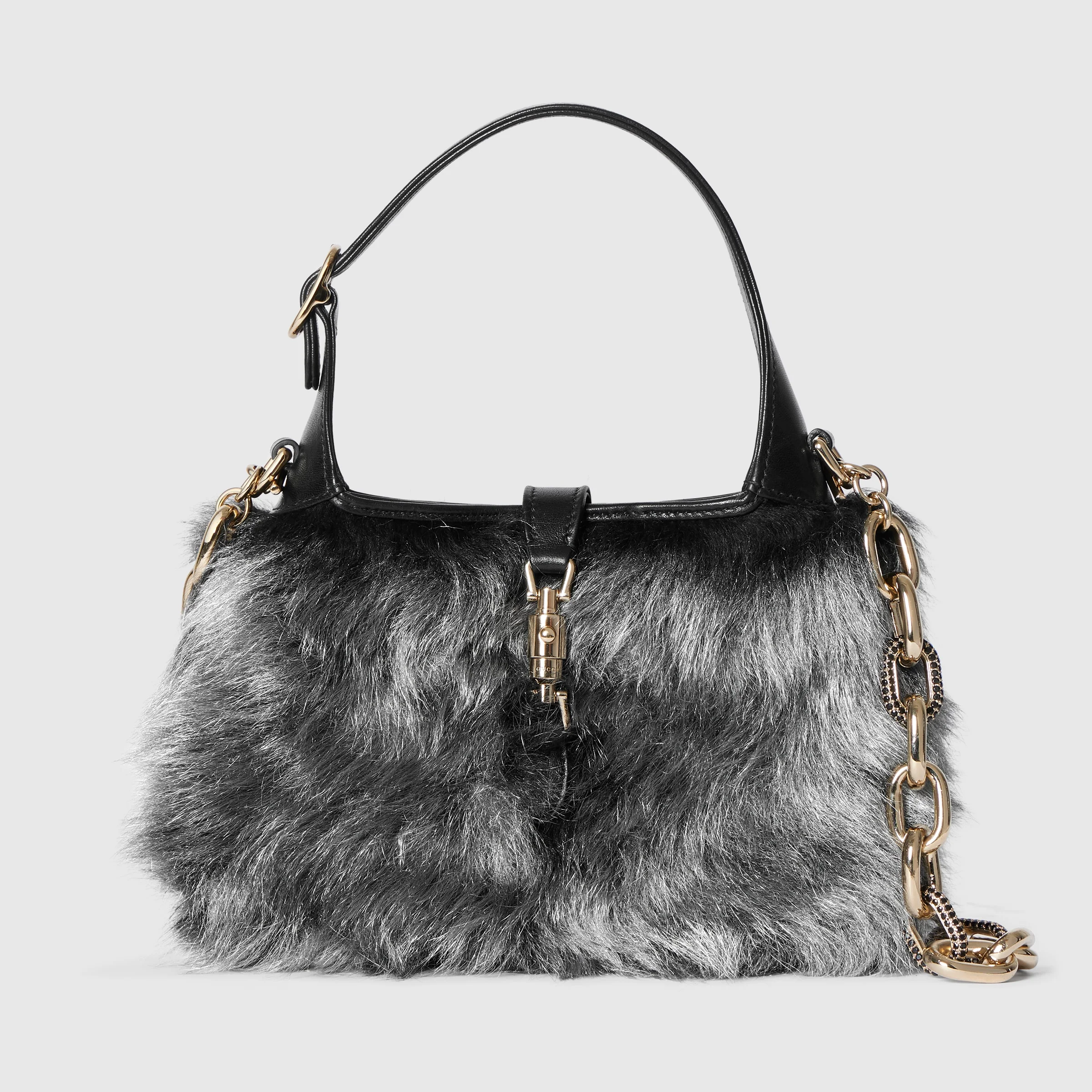 The Gucci Jackie 1961 with its signature piston closure and emblematic shape tells a story that spans eras. Crafted in sumptuous long-haired shearling, this style is complete with an intricate chain shoulder strap in light gold-toned finish. - Dark grey long-haired shearling - Black leather trim - Light gold-toned hardware - Black leather lining - Inside: 1 card slot - 5.9" handle drop - Adjustable leather shoulder strap with extender: 5.5" - 6.3"; drop 17.3" - 22.4". Chain strap drop: 13" - Piston closure - 8.7"W x 6.3"H x 1.6"D - Weight: 12.3oz approximately