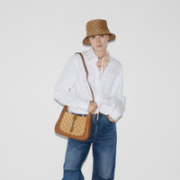 The Gucci Jackie 1961 with its signature piston closure and emblematic shape tells a story that spans eras. The shoulder bag exudes timeless elegance with a contemporary edge. - Natural and brown GG raffia-effect fabric - Brown leather trim with contrast stitching - Light gold-toned hardware - Brown cotton linen lining - Interior: 1 zip pocket with Gucci Crest zip puller - 7.1" handle drop - Additional leather strap with 20.5" drop - Piston closure - Small: 10.8"W x 7.5"H x 1.6"D - Weight: 0.9lbs, approximately - Made in Italy - Fits iPhone Pro Max/Plus, Airpods, long wallet, and lipstick