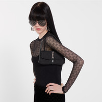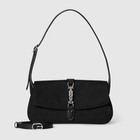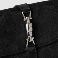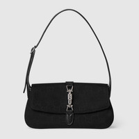 Introducing Spring Summer 2026. New small leather goods designs pay tribute to the Gucci Jackie 1961 with contemporary shapes and multifunctionality. This style can be carried over the shoulder or crossbody with the additional strap. Crafted from lightweight yet structured GG canvas, it is complete with the palladium-toned piston hardware and effortlessly fits an iPhone. - Black GG canvas - Black soft grainy leather trim - Palladium-toned hardware - Black fabric lining with Diamante motif - Inside: 1 zip pocket - Handle drop: 7.1"; with extender strap: 17.7" - Adjustable leather strap and extender - Piston with magnetic closure - 8.5"W x 4.5"H x 0.8"D - Weight: 7oz approximately - Made in Italy - Fits iPhone Pro Max/Plus, Airpods, card case, and lipstick