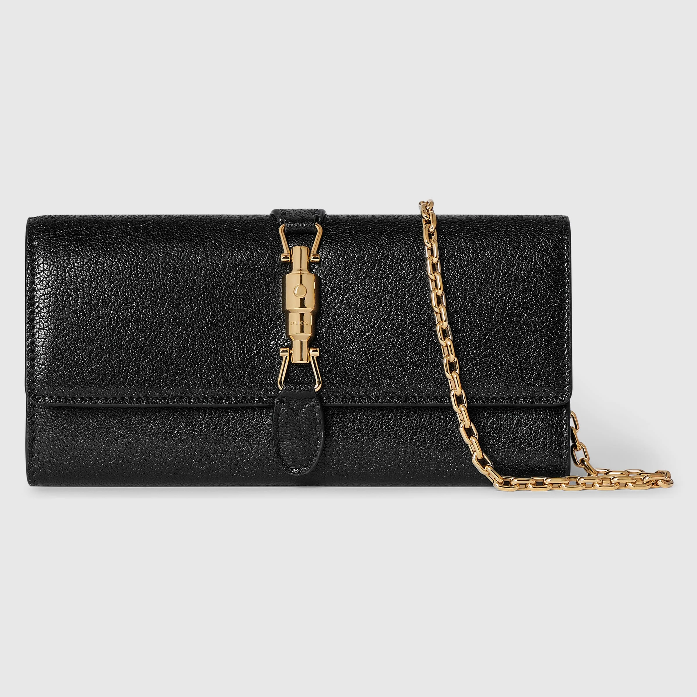 Introducing Spring Summer 2026. New small leather goods designs pay tribute to the Gucci Jackie 1961 with contemporary shapes. This style can be carried over the shoulder. Crafted from soft leather, it complete with the piston hardware in gold-toned finish. - Black soft grainy leather with natural glossy finish - Gold-toned hardware - Black fabric lining - Inside: 1 open compartment, 1 zip pocket, 1 flat pocket, 6 card slots - Detachable chain strap drop: 15.7" - Piston with snap button closure - 7.5"W x 3.5"H x 1.6"D - Weight: 8oz approximately - Made in Italy - Fits iPhone Pro Max/Plus and Airpods