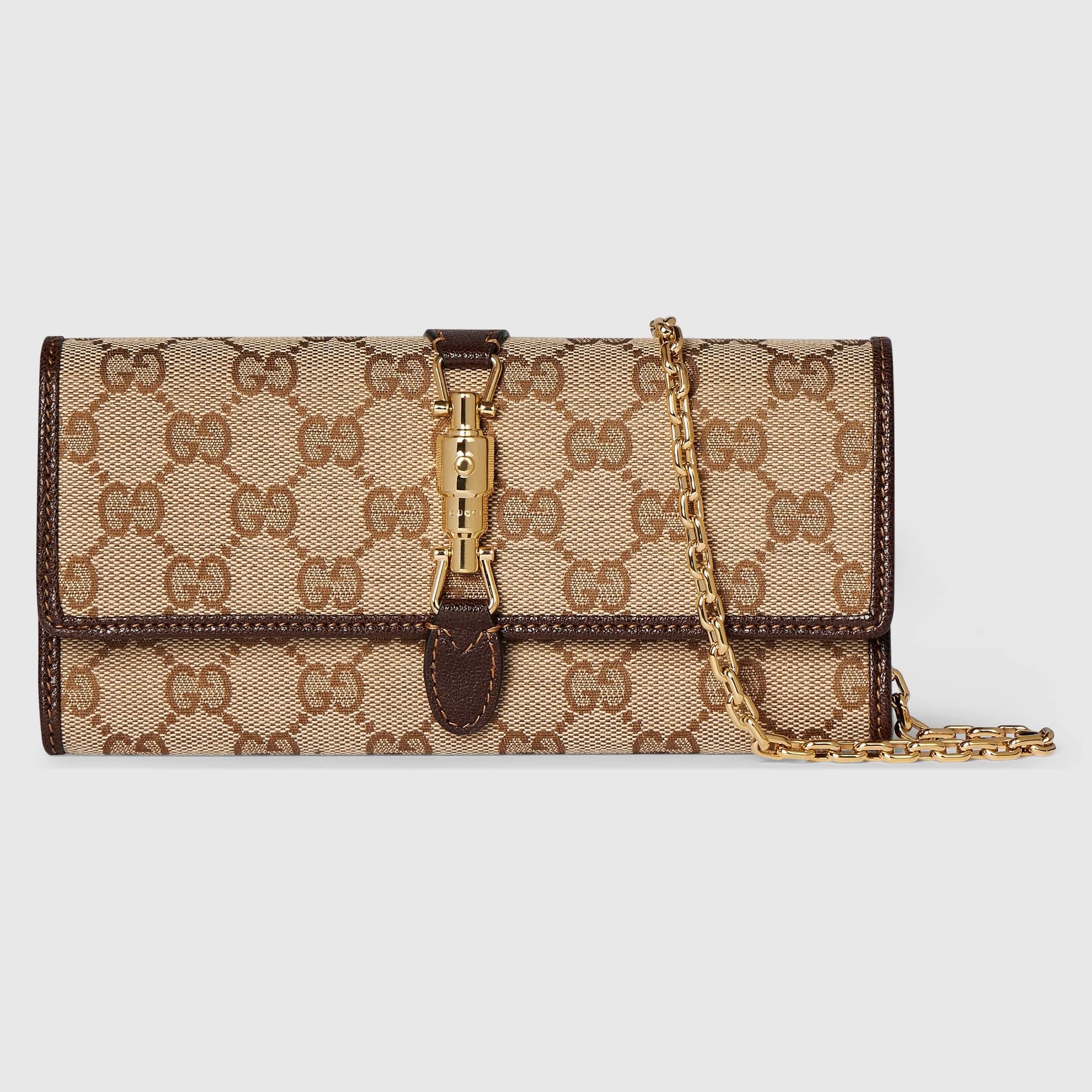 Introducing Spring Summer 2026. New small leather goods designs pay tribute to the Gucci Jackie 1961 with contemporary shapes. This style can be carried over the shoulder. Crafted from lightweight yet structured GG canvas, it is complete with the piston hardware in gold-toned finish. - Sand and dark brown GG canvas - Dark brown soft grainy leather trim - Gold-toned hardware - Brown fabric lining - Inside: 1 open compartment, 1 zip pocket, 1 flat pocket, 6 card slots - Detachable chain strap drop: 15.7" - Piston with snap button closure - 7.5"W x 3.5"H x 1.6"D - Weight: 8oz approximately - Made in Italy - Fits iPhone Pro Max/Plus and Airpods