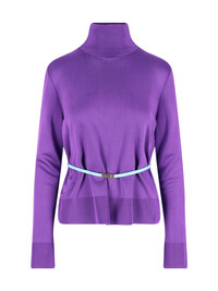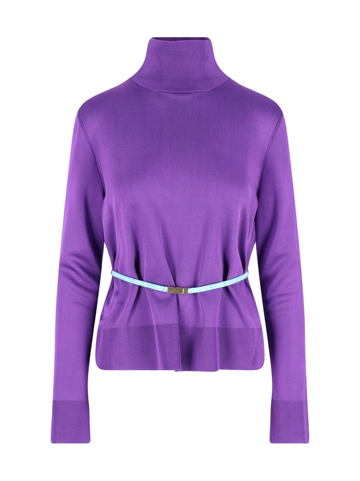 GUCCI TURTLENECK SWEATER IN PURPLE FABRIC WITH LONG SLEEVES, CONTRAST WAIST BELT, METAL LOGO BUCKLE, RIBBED TRIM AND STRAIGHT HEM. PRODUCT INFO PRODUCT CODE 857800 XKFAV5378 COMPOSITION: 100% VISCOSE SIZE AND FIT: REGULAR FIT MADE IN: ITALY