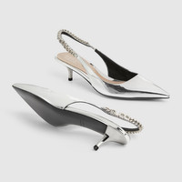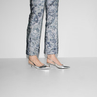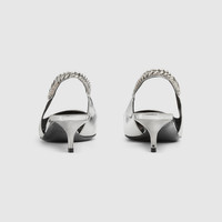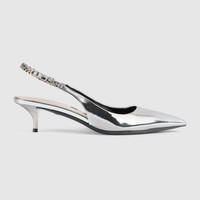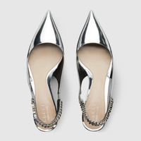 The Gucci Signoria pump, named after the central piazza of Florence, recalls the classic elegance of the House’s founding city. With fine leather, pointed toe and eye-catching Gucci chain, this slingback style elevates the everyday wardrobe for the coming season. - Silver metallic leather - Women's - Leather lining - Pointed toe - Gucci chain, stitched by hand - Leather sole - Elastic slingback closure - Low heel - 1.7" heel height; based on a size 37 (IT) - Made in Italy