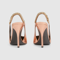 Gucci Nojum takes its name from the Arabic word 'Nojum', meaning 'stars' in English. The line presents an elegant range of signature styles designed to celebrate beautiful night skies, with metallics, sparkling details and delicate color palettes. This Gucci Signoria slingback pump is crafted in metallic leather. - Metallic copper leather - Women's - Leather lining - Pointed toe - Gucci chain, stitched by hand - Leather sole - Elastic slingback closure - High heel - 4.1" heel height; based on a size 37 (IT) - Made in Italy