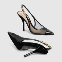 The Gucci Signoria pump, named after the central piazza of Florence, recalls the classic elegance of the House’s founding city. Crafted in mesh with fine leather trim, pointed toe and eye-catching Gucci chain, this slingback style elevates the everyday wardrobe for the coming season. - Black mesh - Women's - Black patent leather trim - Leather lining - Pointed toe - Gucci chain, stitched by hand - Leather sole - Elastic slingback closure - High heel - 4.1" heel height; based on a size 37 (IT) - Made in Italy