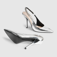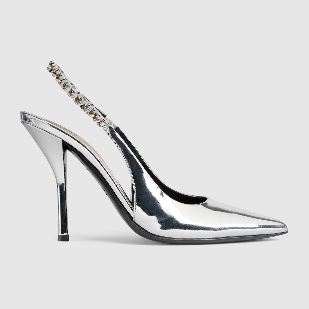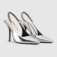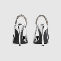 The Gucci Signoria pump, named after the central piazza of Florence, recalls the classic elegance of the House’s founding city. With its shiny metallic leather, pointed toe and eye-catching Gucci chain, this slingback style elevates the everyday wardrobe for the coming season. - Silver metallic leather - Women's - Leather lining - Pointed toe - Gucci chain, stitched by hand - Leather sole - Elastic slingback closure - High heel - 4.1" heel height; based on a size 37 (IT) - Made in Italy