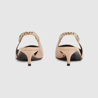 The Gucci Signoria pump, named after the central piazza of Florence, recalls the classic elegance of the House’s founding city. With fine leather, pointed toe and eye-catching Gucci chain, this slingback style elevates the everyday wardrobe for the coming season. - Light pink leather - Women's - Pointed toe - Gucci chain, stitched by hand - Leather sole - Elastic slingback closure - Low heel - 1.7" heel height; based on a size 37 (IT) - Made in Italy