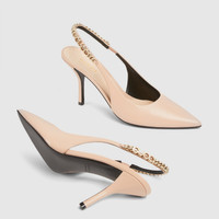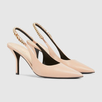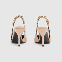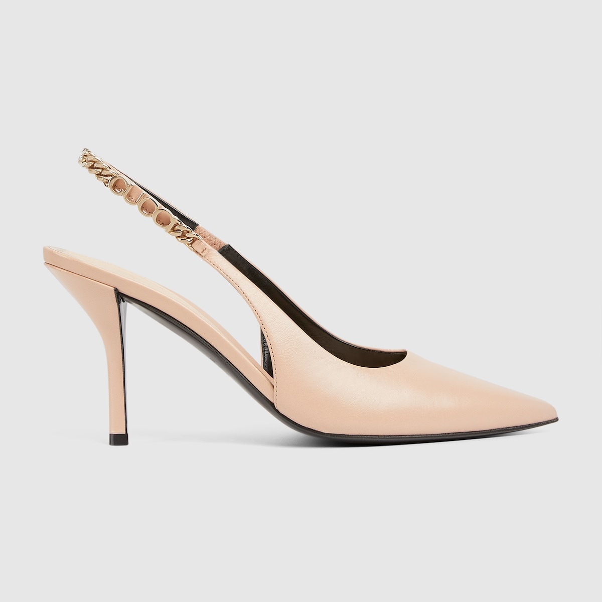 The Gucci Signoria pump, named after the central piazza of Florence, recalls the classic elegance of the House’s founding city. With fine leather, pointed toe and eye-catching Gucci chain, this slingback style elevates the everyday wardrobe for the coming season. - Light pink leather - Women's - Light gold-toned hardware - Pointed toe - Gucci chain, stitched by hand - Leather sole - Elastic slingback closure - High heel - 4.1" heel height; based on a size 37 (IT)