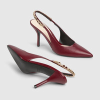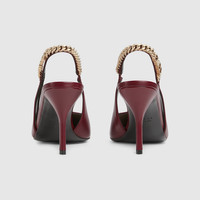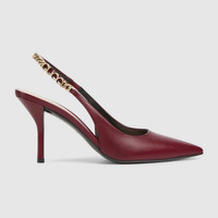 The Gucci Signoria pump, named after the central piazza of Florence, recalls the classic elegance of the House’s founding city. With fine leather, pointed toe and eye-catching Gucci chain, this slingback style elevates the everyday wardrobe for the coming season. - Gucci Rosso Ancora red leather - Women's - Light gold-toned hardware - Pointed toe - Gucci chain, stitched by hand - Leather sole - Elastic slingback closure - High heel - 4.1" heel height; based on a size 37 (IT)
