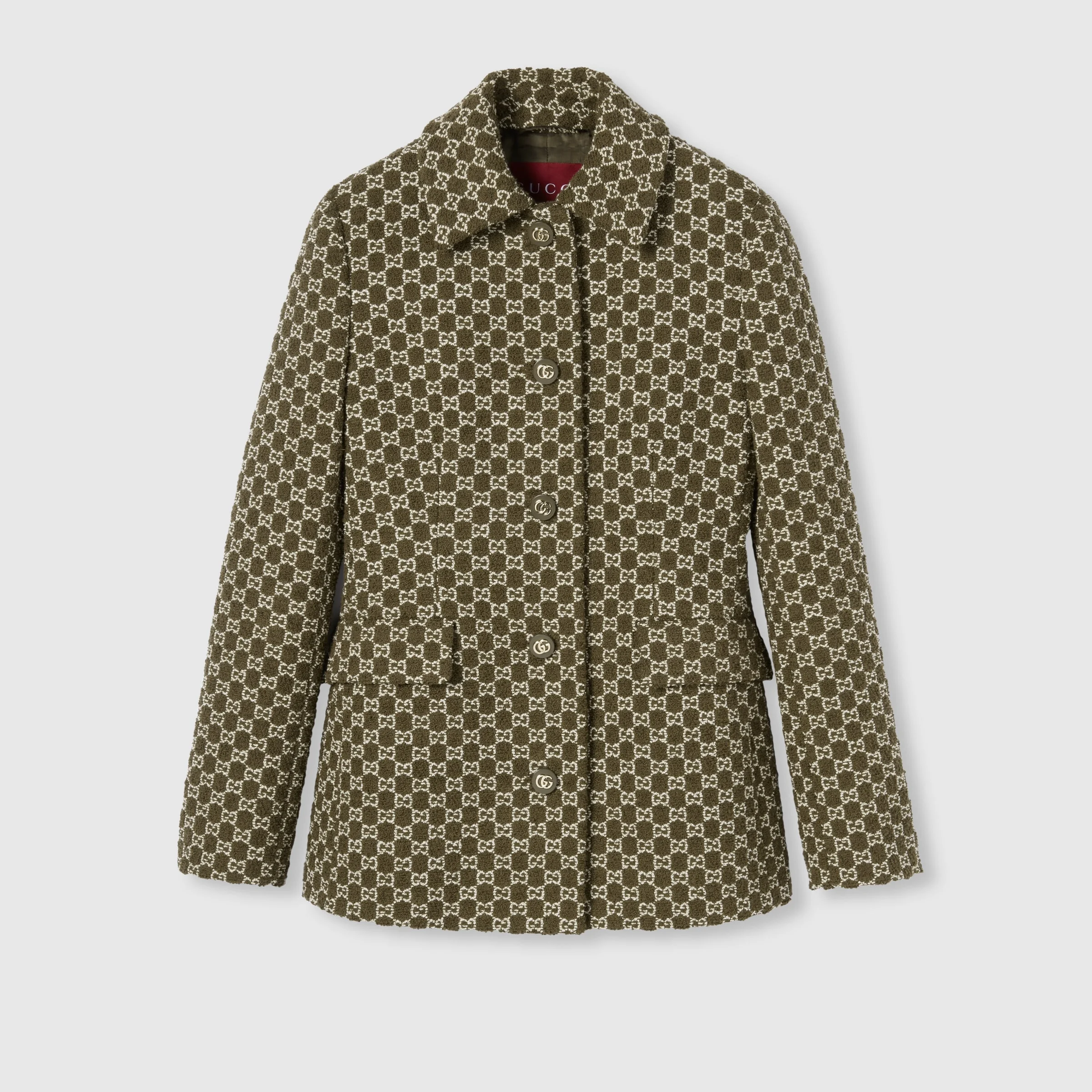 Green defines the color narrative for Pre-Fall 2025 and speaks volume with textures, logo details and varying tonalities, as seen on the runway. Appearing in forest green and white, this jacket is crafted from GG cotton boucle has a bon-ton feel, further enriched by the gold-toned Double G buttons. - Forest green and white GG cotton boucle - Self-covered gold-toned Double G buttons - Lined - Point collar - Two flap pockets - Button closure - Made in Italy