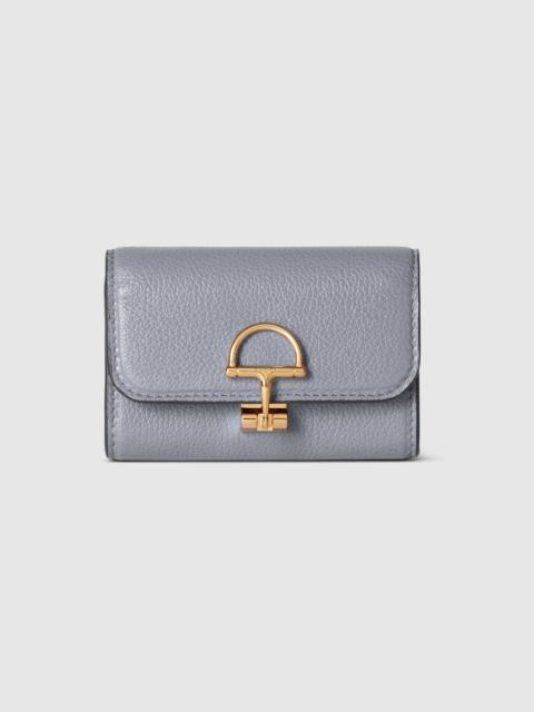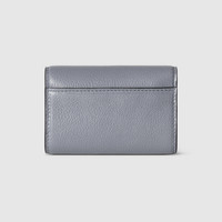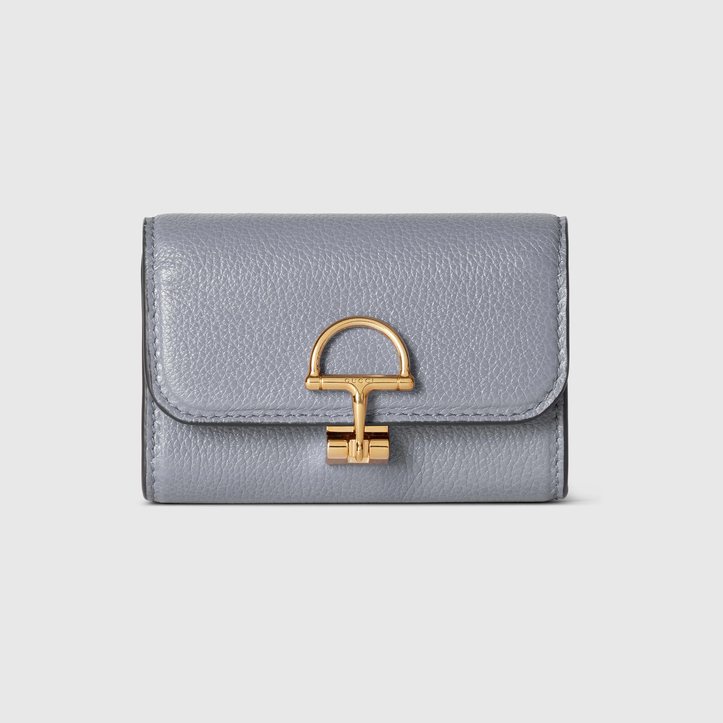 Gucci continues to expand upon its heritage and bond with the equestrian world. The half-Horsebit motif defines a selection of small leather goods as part of the closure detail. Here, the emblematic symbol appears on this card case. - Grey grainy leather - Gold-toned hardware - Half-Horsebit - Inside: 1 zip pocket, 1 flat pocket, 1 compartment - Outside: 1 open pocket - Snap closure - 4.1"W x 2.7"H x 1.2"D - Weight: 0.14lbs, approximately - Made in Italy