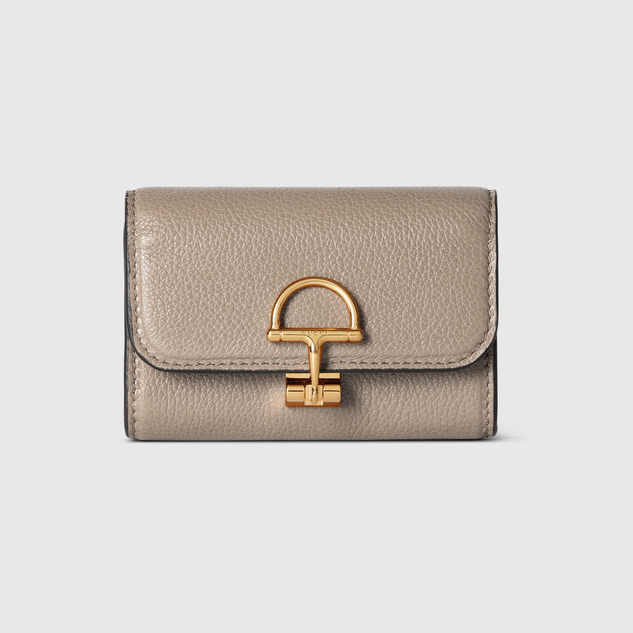 Gucci continues to expand upon its heritage and bond with the equestrian world. The half-Horsebit motif defines a selection of small leather goods as part of the closure detail. Here, the emblematic symbol appears on this card case. - Taupe grainy leather - Gold-toned hardware - Half-Horsebit - Inside: 1 zip pocket, 1 flat pocket, 1 compartment - Outside: 1 open pocket - Snap closure - 4.1"W x 2.7"H x 1.2"D - Weight: 0.14lbs, approximately - Made in Italy