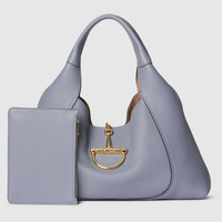 The new Gucci Softbit shoulder bag reimagines the House’s signature hardware as an oversized half Horsebit. It is both aesthetic and functional as the magnetic closure of the relaxed silhouette, crafted from supple, grainy leather with a rich texture. - Grey grainy leather - Gold-toned hardware - Brown microfiber lining - Inside: detachable pouch - Shoulder strap drop: 7.9" - 18.1"W x 10.2"H x 6. - Weight: 3.1lbs, approximately - Made in Italy - Fits iPhone Pro Max/Plus, Airpods, long wallet, and lipstick
