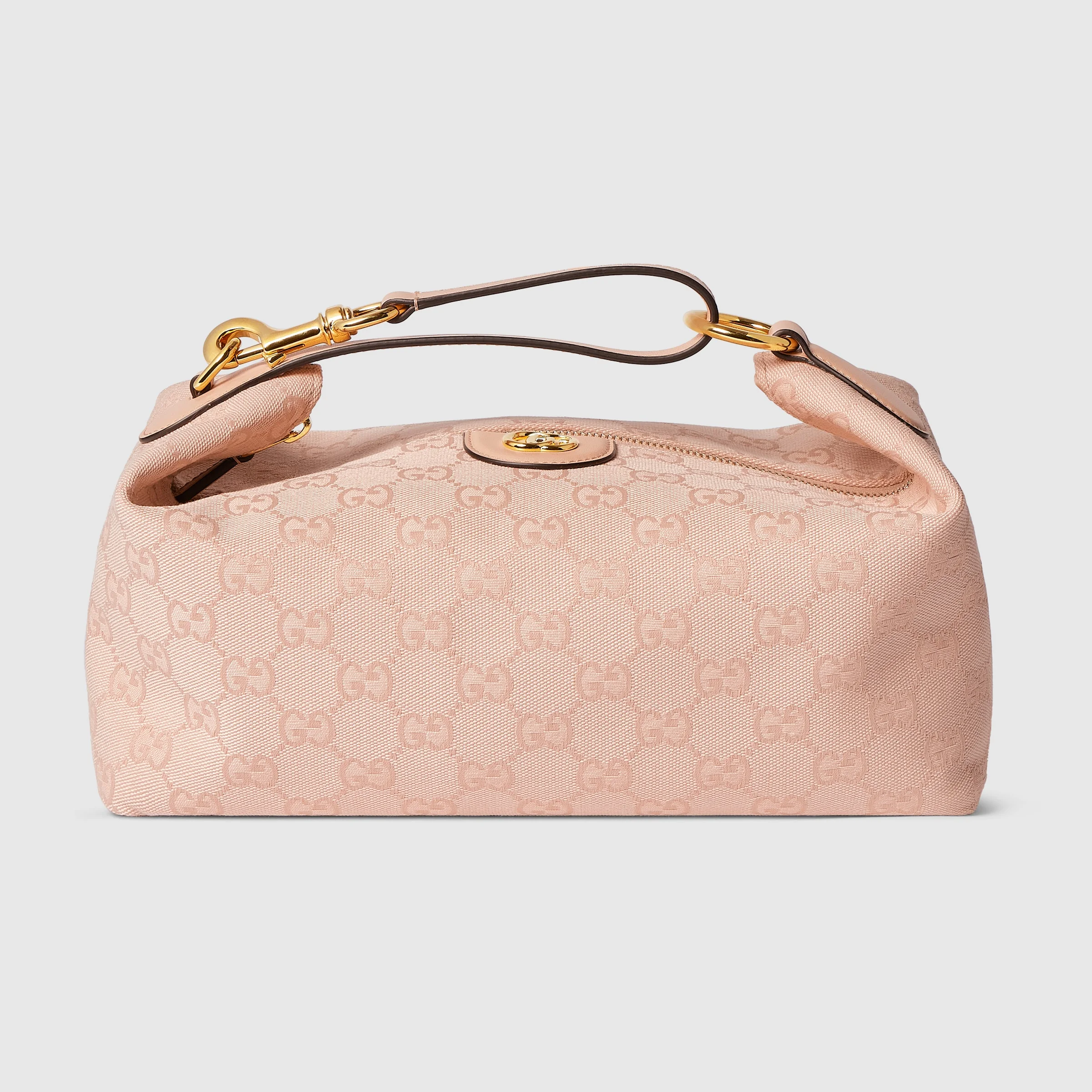 Gucci Vanity transforms inspirations from the classic beauty case into a striking silhouette that can be worn in three different ways. This bag can be carried over the shoulder, or as a top handle with the strap doubled up. It also can be styled as a crossbody bag with an additional strap. - Pink GG canvas - Pink leather trim - Gold-toned hardware - Light pink cotton linen lining - Double G - Sliding top handle: 1.6" - 16.5" - Detachable and adjustable leather shoulder strap - Zip closure - 10.8"W x 5.1"H x 5.7"D - Weight: 1lbs approximately - Made in Italy - Fits iPhone Pro Max/Plus, Airpods, long wallet, and lipstick
