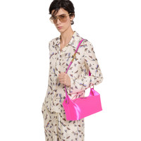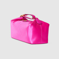 Gucci Vanity transforms inspirations from the classic beauty case into a striking silhouette that can be worn in three different ways. This bag can be carried over the shoulder, or as a top handle with the strap doubled up. It also can be styled as a crossbody bag with an additional strap. - Fuchsia silk satin - Fuchsia leather trim - Gold-toned hardware - Fuchsia silk satin lining - Double G - Sliding top handle: 1.6" - 16.5" - Detachable and adjustable leather shoulder strap - Zip closure - 10.8"W x 5.1"H x 5.7"D - Weight: 1lbs approximately - Made in Italy - Fits iPhone Pro Max/Plus, Airpods, long wallet, and lipstick