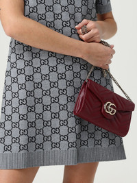 DESCRIPTION - Style: Elegant - Logo: Gucci GG monogram - Lining: With 6 card slots - Model: Crossbody - Closure: With button flap - Shape: Rectangular - Shoulder strap: Metal mesh - Measurements: Shoulder strap length from shoulder: 60 cm - Materials: Matelasse leather - Pattern: Monogram DETAILS AND CARE Composition CALF SKIN SIZE AND FIT Sizes Width : 20 cm Height: 12 cm Depth: 4 cm Designer code: 837745AAET8 6207 Giglio Code: 432858 Designer: Gucci Collection: Gucci Woman Category: Bags Gucci