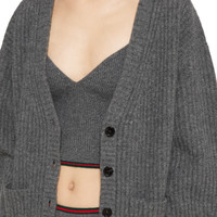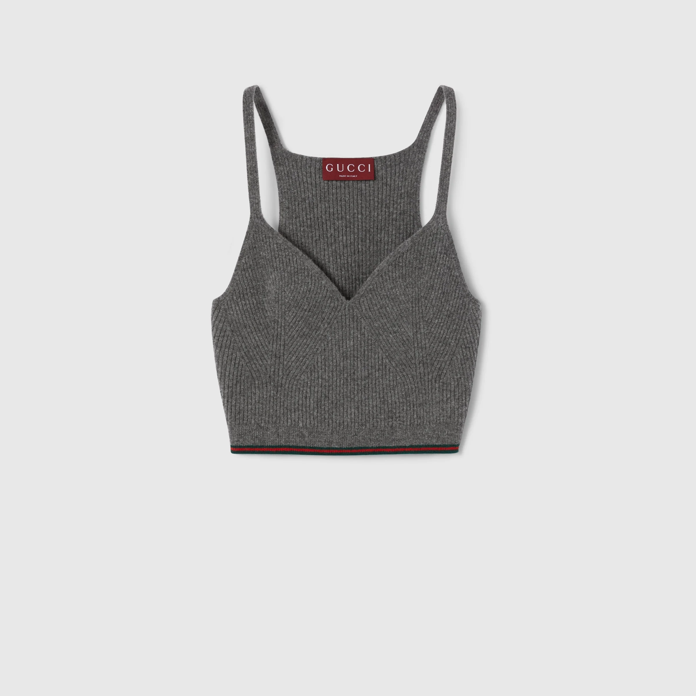 The Pre-fall 2025 collection introduces a new take on warm materials on sophisticated leisure pieces, in traditional and contemporary silhouettes. This v-neck strappy top is crafted from a soft rib felted wool and is complete with the archival Web trim. - Dark grey soft rib felted wool - Web trim - Two shoulder straps - V-neck - Made in Italy