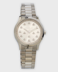 Gucci stainless steel watch 32mm round watch head Threelink bracelet with deployant closure Dial decorated with signature bee motif Threehand automatic movement Water resistant to 5 ATM Made in Switzerland
