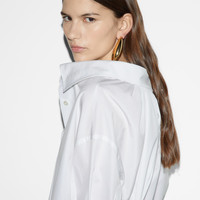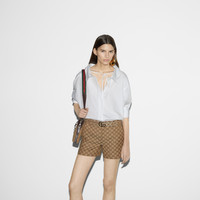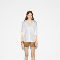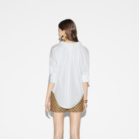 The piece is part of Sabato De Sarno's debut collection, offering a modern take on the House's well-known codes and symbols. This cotton poplin shirt provides many styling options thanks to drawstrings at the neck that allow you to wear the piece as a V-neck or a classic point-neck shirt. The relaxed fit nods to contemporary volumes and silhouettes that express femininity through an effortless look. - White heavy cotton poplin - Embossed Gucci logo at the neck - Gold-toned Gucci lettering detail at the cuffs - V-neck with self-tie - Three-quarter sleeves - Button closure - Cut for a slightly oversize fit - Length: 26.2" ; based on a size 42 (IT) - Made in Italy - The model is 5'8" and is wearing size 42 (IT)