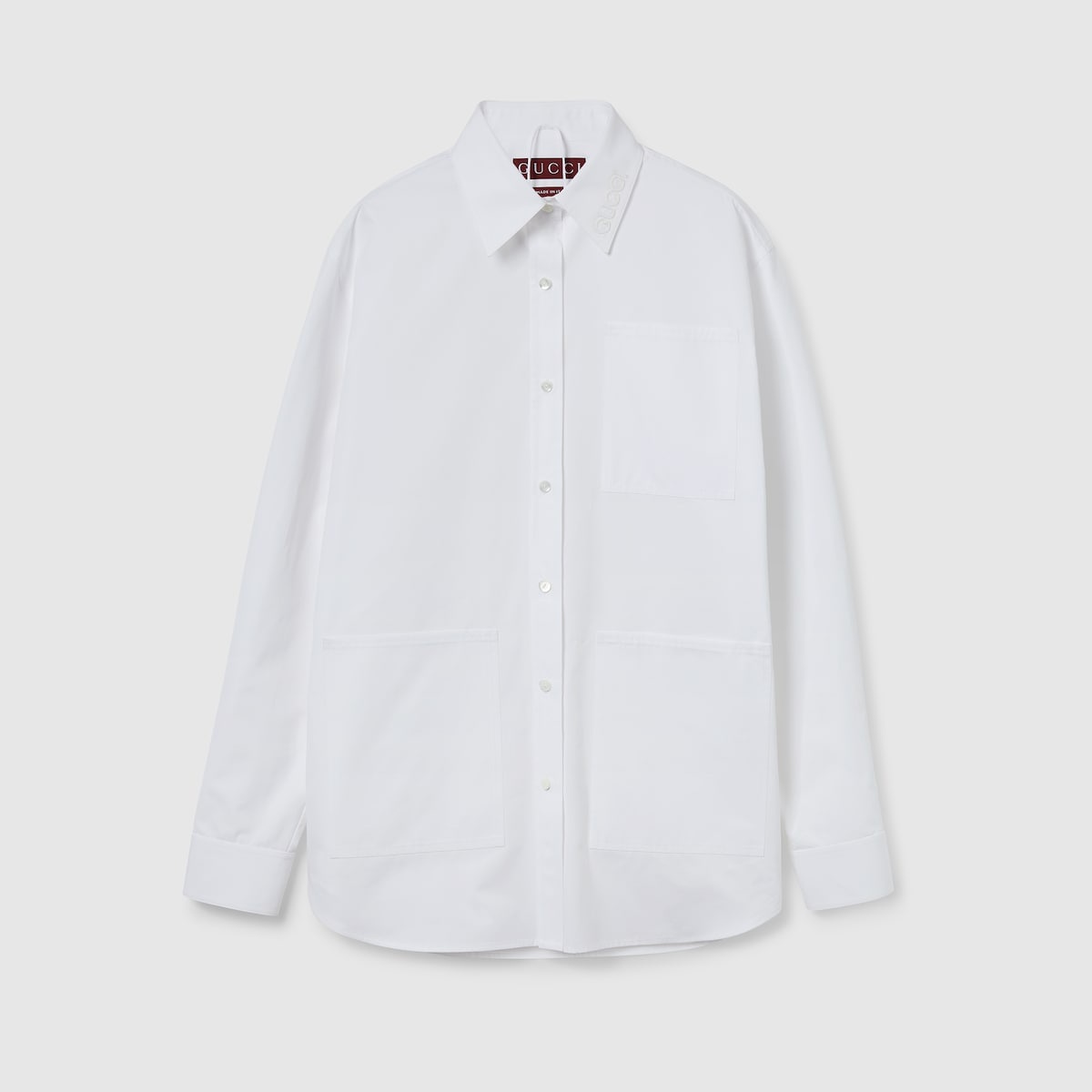Classics such as elegant shirts and tailored jackets throughout the Gucci Cruise 2025 collection stand out with subtle details that elevate everyday looks. This style is crafted from white heavy cotton poplin and features a self-tie neck ribbon. - White heavy cotton poplin - Gucci embossed detail - Point neck - Self-tie neck ribbon - three patch pockets - Button closure - Length: 31"; based on a size 42 (IT) - Made in Italy - The model is 5'9" tall and is wearing size 42 (IT)